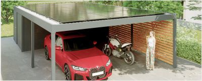 Flachdachcarport mit undurchsichtigem Dach und optionalem Gründach bzw. Planung einer PV-Anlage.