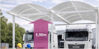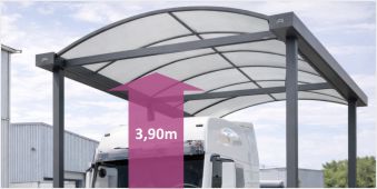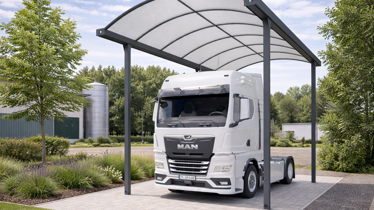 Carports für LKW brauchen eine größere Durchfahrt als andere Carports. Wir bieten Ihnen maßgeschneiderte Lösungen für Ihren LKW mit einer Durchfahrtshöhe bis zu 3,90m. Aus statischen Gründen werden bei den Alucarports zum Teil Stahlpfosten verwendet. Zudem empfehlen wir, nur die längeren Pfosten zum einbetonieren zu verwenden.